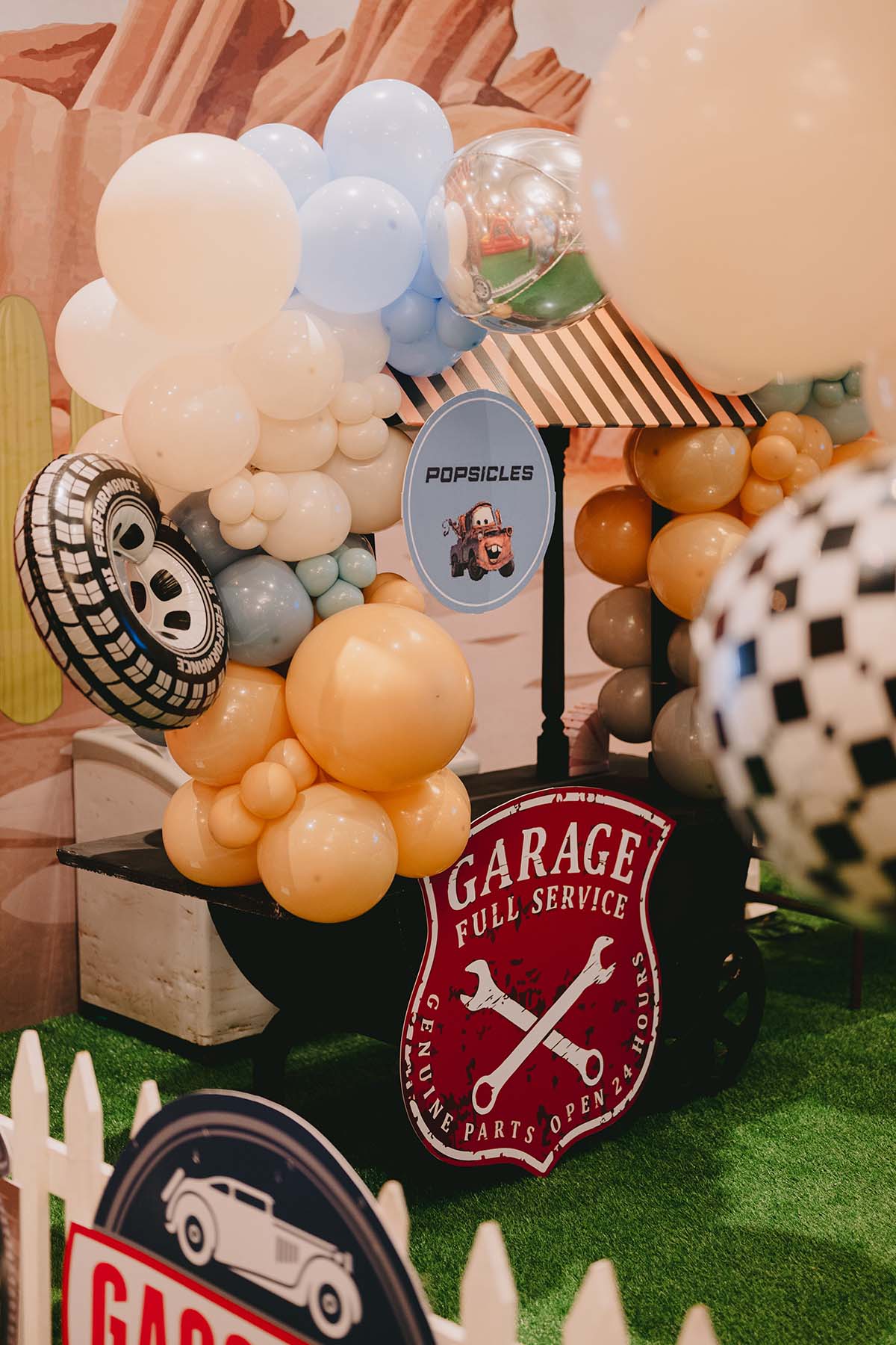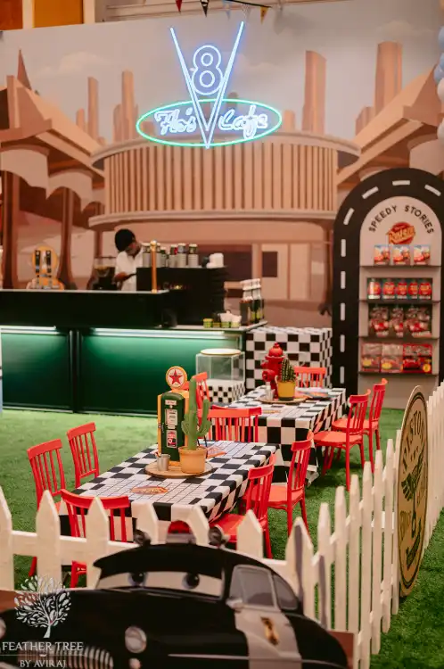 A stunning three-tier birthday cake took centre stage, followed by thoughtfully curated return gifts for all the children. The food experience was equally exciting, with fun live counters including pizza and pasta stations, popcorn and fries counters, interactive snack setups, and Cars-themed dessert displays that delighted both kids and adults.